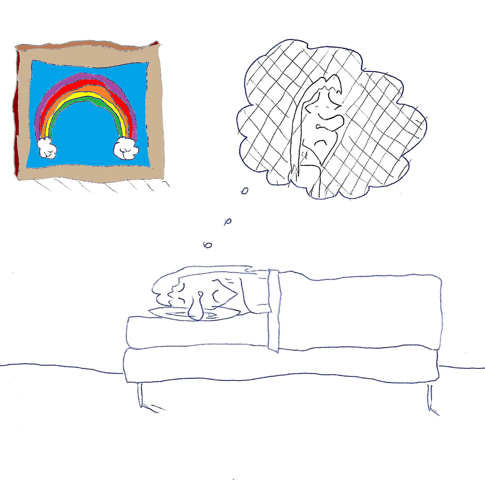 This is a song about how, ever since I caught Covid, I haven't dreamed in color. All my dreams are dark brown, the color of what I see behind my closed eyelids, as if I'm dreaming about having my eyes closed. I guess I actually see stuff, but it's all the same soupy mess of dark-brown-ness. I wonder if my dreams'll ever get normal again. Anyway, that's what this song's about. I think the thing this song's about could also be a metaphor for depression and stuff. A depressed person walks through life as if in a colorless dream.